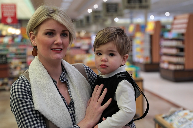 Litchfield thought she should take it upon herself to make something that would do the trick. When her other son, Nathan, (pictured at right wearing the vest with Litchfield) nearly toppled out of a shopping cart a few years later, Litchfield knew she had to design a product.